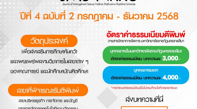ขอเชิญชวนส่งบทความเพื่อตีพิมพ์ในวารสารวิทยาการจัดการ มหาวิทยาลัยราชภัฏนครราชสีมา (Journal of Management Science Nakhon Ratchasima Rajabhat University : JMS NRRU) ปีที่ 4 ฉบับที่ 2