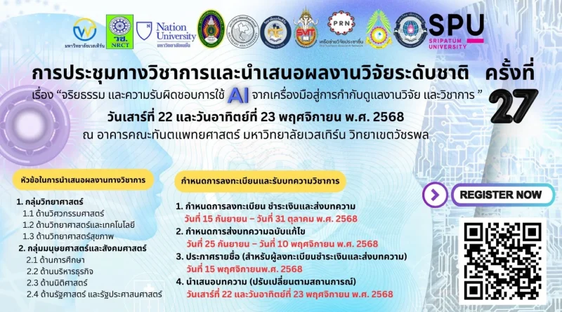 conference 6 ตุลาคม 2025 admin ประชาสัมพันธ์การประชุมวิชาการและการนำเสนอผลงานวิจัยระดับชาติ ครั้งที่ 27 เรื่อง “จริยธรรมและความรับผิดชอบในการใช้ Al : จากเครื่องมือสู่การกำกับดูแลงานวิจัยและ วิชาการ” ประชาสัมพันธ์การประช Read More
