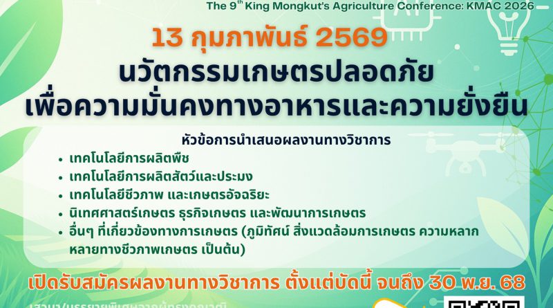 ขอเชิญชวนส่งผลงานเข้าร่วมนำเสนอบทความวิชาการภายในการประชุมวิชาการพระจอมเกล้าเจ้าคุณทหารลาดกระบัง ครั้งที่ 9 (The 9th King Mongkut’s Agriculture Conference: KMAC 2026)