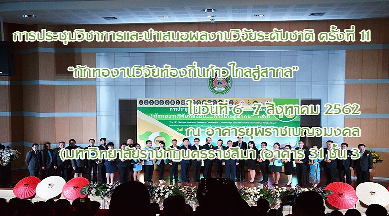 สถาบันวิจัยและพัฒนา มหาวิทยาลัยราชภัฏนครราชสีมา ได้กำหนดจัดการประชุมวิชาการและนำเสนอผลงานวิจัยระดับชาติ ครั้งที่ 11 ภายใต้ชื่อ “ถักทองานวิจัยท้องถิ่น…ก้าวไกลสู่สากล” (The National Academic Research Conference 11th “Connecting Local Research to International Perspectives”) ในวันที่ 6-7 สิงหาคม 2562 ณ อาคารยุพราชเบญจมงคล มหาวิทยาลัยราชภัฏนครราชสีมา (อาคาร 31 ชั้น 3) ซึ่งมีวัตถุประสงค์เพื่อสร้างสรรค์กิจกรรมการพัฒนาการเรียนการสอน การวิจัย การประกันคุณภาพการศึกษา และการบริการวิชาการที่มีคุณภาพ ตลอดจนการแลกเปลี่ยนเผยแพร่ข่าวสารและผลงานทางวิชาการ อันจะนำไปสู่การใช้ประโยชน์ และองค์ความรู้ต่างๆ ในศาสตร์ ด้านมนุษยศาสตร์และสังคมศาสตร์ วิทยาการจัดการ และการศึกษา