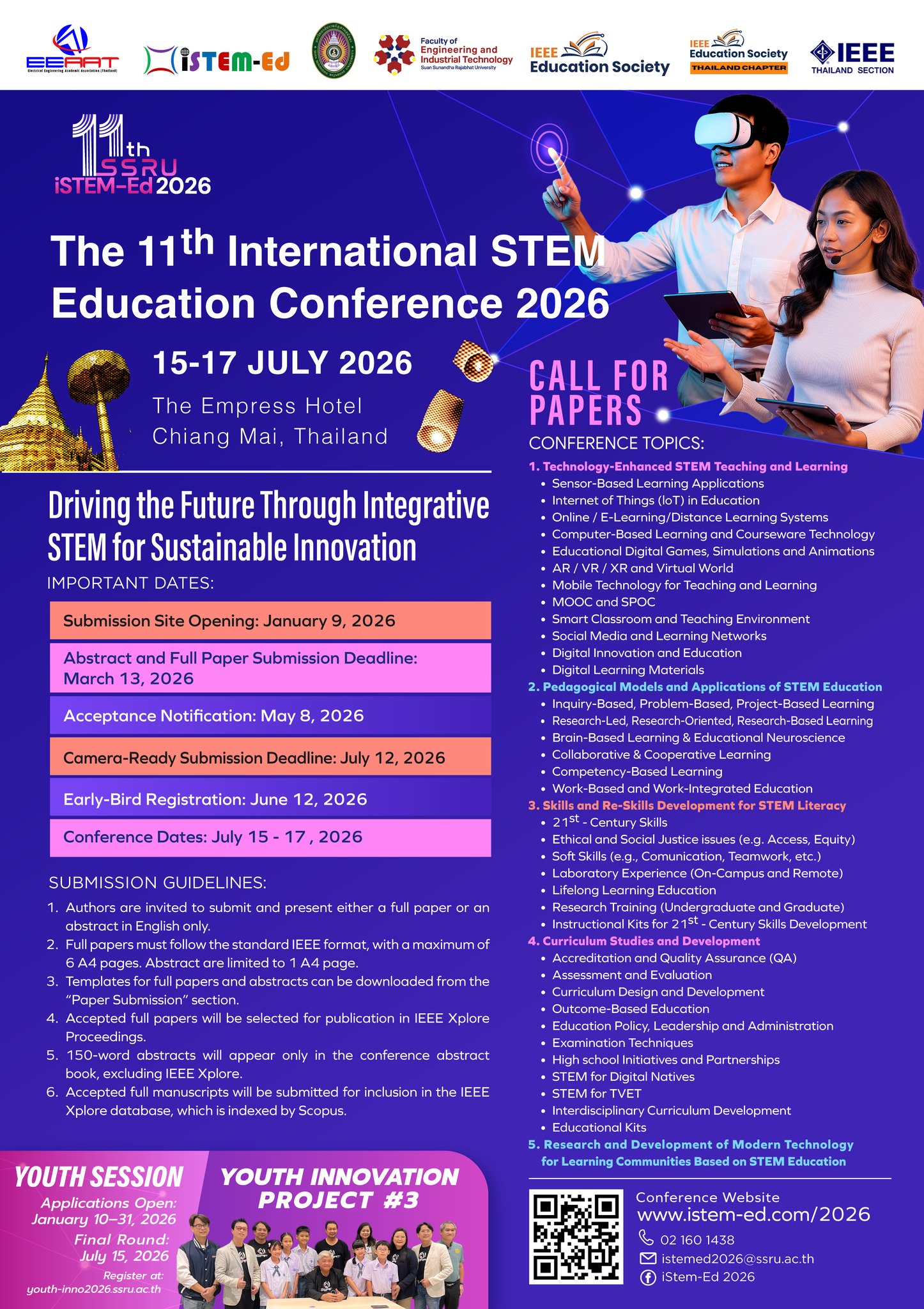 ด้วยคณะวิศวกรรมศาสตร์และเทคโนโลยีอุตสาหกรรม มหาวิทยาลัยราชภัฏสวนสุนันทา กำหนดจัดการประชุมวิชาการระดับนานาชาติ The 11t International STEM Education Conference 2026 (ISTEM-Ed 2026) ระหว่างวันที่ 15 – 17 กรกฎาคม พ.ศ. 2569 ณ โรงแรม The Empress Hotel จังหวัดเชียงใหม่ ภายใต้แนวคิด “Driving the Future Through Integrative STEM for Sustainable Innovation”