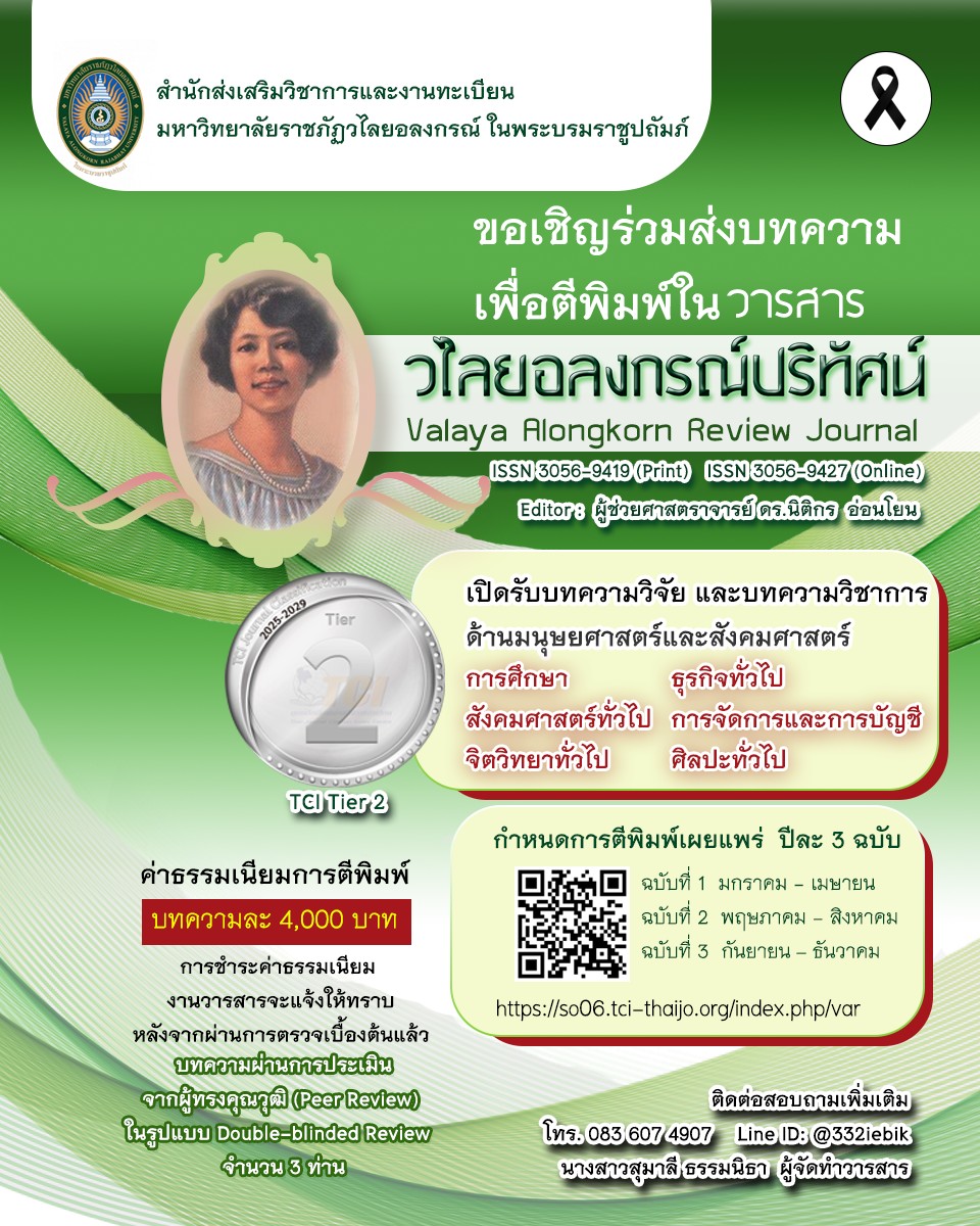 ด้วยสำนักส่งเสริมวิชาการและงานทะเบียน มหาวิทยาลัยราชภัฏวไลยอลงกรณ์ ในพระบรมราชูปถัมภ์ได้จัดทำวารสารวิชาการ ภายใต้ชื่อภาษาไทย “วารสารวไลยอลงกรณ์ปริทัศน์” ชื่อภาษาอังกฤษ “Valaya Alongkorn Review Journal” เพื่อเปิดรับบทความวิจัย และบทความวิชาการ ด้านมนุษยศาสตร์และ สังคมศาสตร์ (สาขาวิชาการศึกษา สังคมศาสตร์ทั่วไป จิตวิทยาทั่วไป ธุรกิจทั่วไป การจัดการและการบัญชีศิลปะทั่วไป) ของคณาจารย์ บุคลากร นักวิจัย และนักศึกษา ทั้งภายในและภายนอกสถาบัน ซึ่งปัจจุบันวารสาร จัดอยู่ในฐานข้อมูลของศูนย์ดัชนีการอ้างอิงวารสารไทย กลุ่มที่ 2