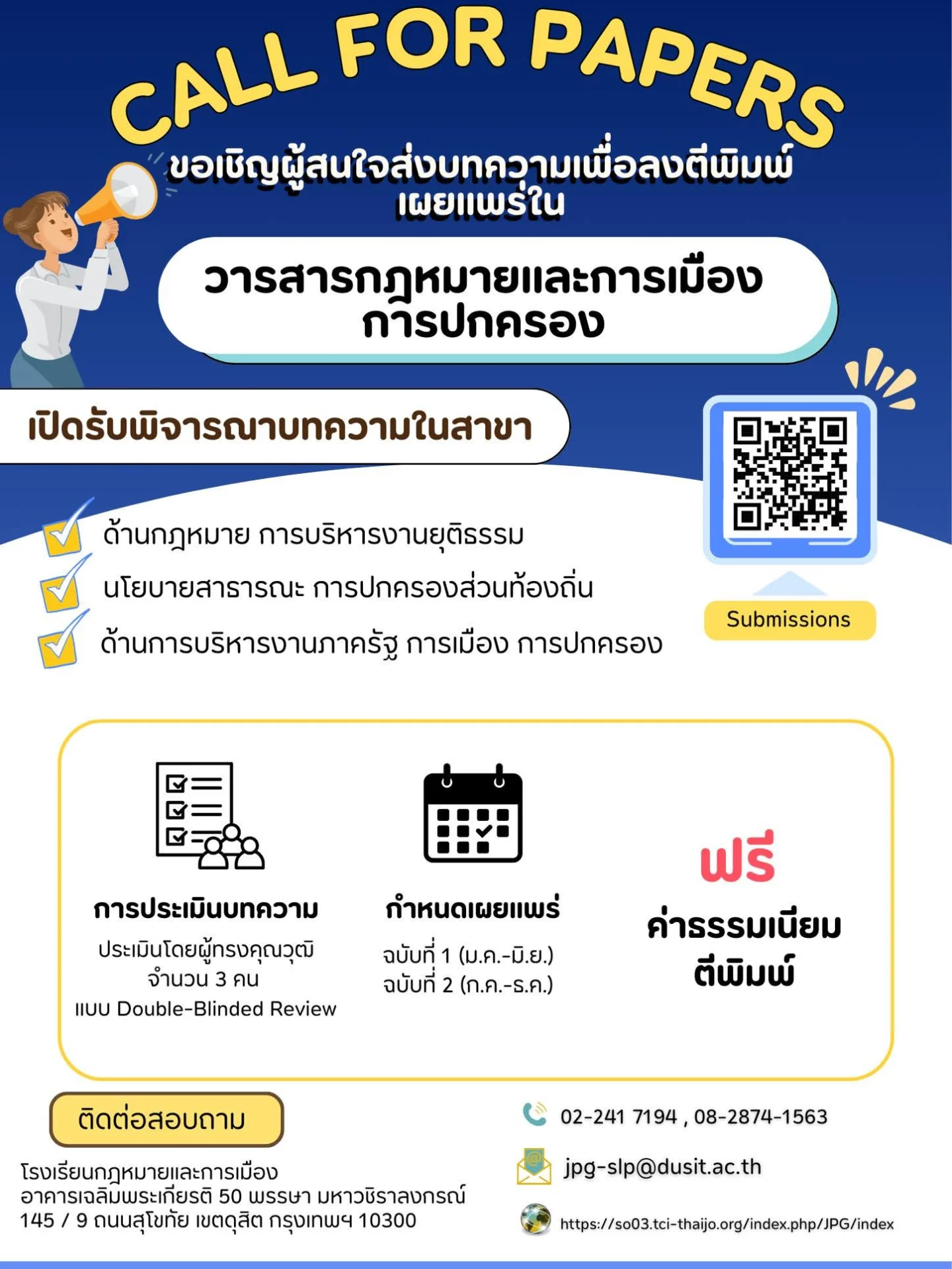 ด้วย โรงเรียนกฎหมายและการเมือง มหาวิทยาลัยสวนดุสิต ได้ดำเนินการจัดทำวารสารกฎหมายและ การเมืองการปกครอง ISSN: 2985-0770 (Print) ISSN. 29850819 (Online)