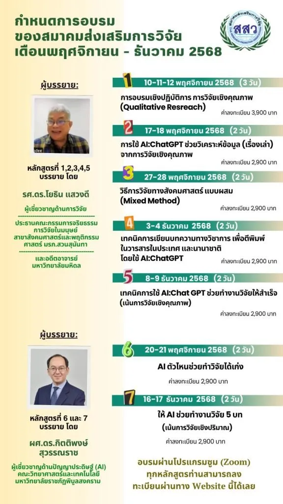 - AI ตัวไหนช่วยทำวิจัยได้เก่ง วันที่ 20-21 พฤศจิกายน 2568 (2 วัน) ค่าลงทะเบียน 2,900 บาท