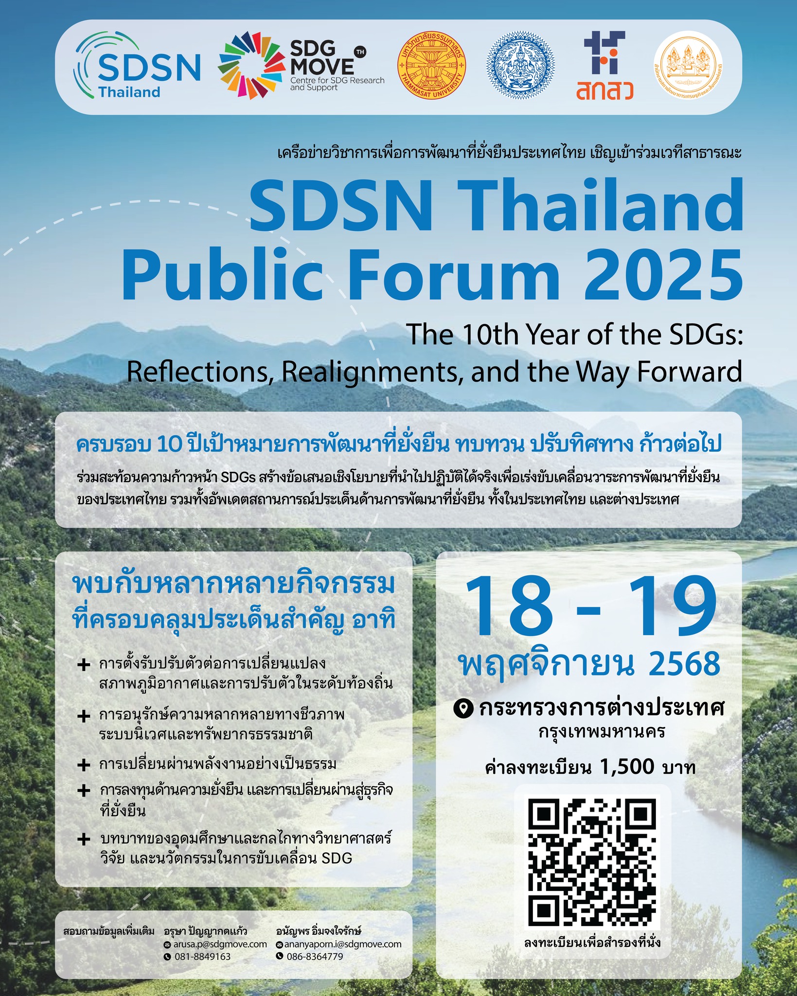 เนื่องด้วยเครือข่ายวิชาการเพื่อการพัฒนาที่ยั่งยืนประเทศไทย (Sustainable Development Solution Network Thailand -SDSN Thailand) โดย ศูนย์วิจัยและสนับสนุนเป้าหมายการพัฒนาที่ยังยืน (SDG Move) มหาวิทยาลัยธรรมศาสตร์ ร่วมกับ กระทรวงการต่างประเทศ สำนักงานสภาพัฒนาการเศรษฐกิจและสังคมแห่งชาติ และสำนักงานคณะกรรมการส่งเสริมวิทยาศาสตร์ วิจัย และนวัตกรรม จัดงาน “เวที่ประชุมวิชาการสาธารณะเครือข่ายวิชาการเพื่อการพัฒนาที่ยั่งยืนประเทศไทย ประจำปีพุทธศักราช 2568 ” (SDSN Thailand Public Forum 2025) ระหว่าง วันที่ 18 – 19 พฤศจิกายน พ.ศ. 2568 ณ กระทรวงการต่างประเทศ กรุงเทพมหานคร ภายใต้แนวคิด “10th Year of the SDGs: Reflections, Realignments, and the Way Forward”