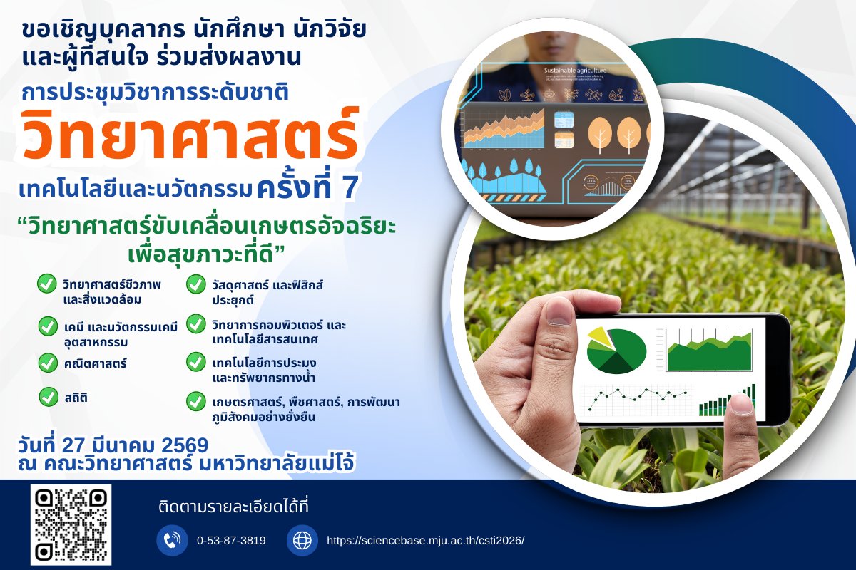 ขอเชิญเข้าร่วมนำเสนอบทความวิจัยในงานประชุมวิชาการระดับชาติ วิทยาศาสตร์ เทคโนโลยีและนวัตกรรม (มหาวิทยาลัยแม่โจ้) ครั้งที่ 7