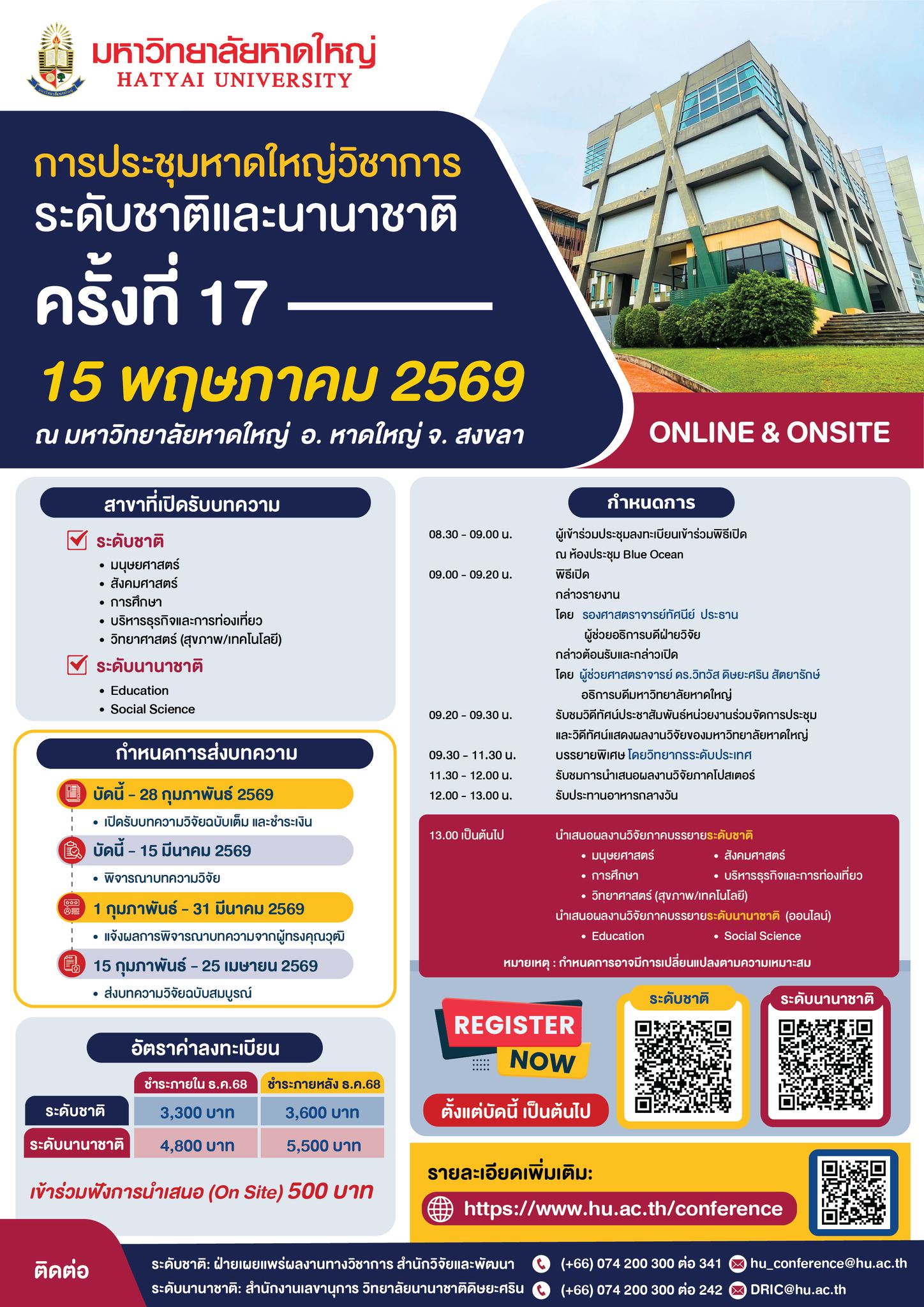 ด้วย มหาวิทยาลัยหาดใหญ่ กำหนดจัดการประชุมหาดใหญ่วิชาการระดับชาติและนานาชาติ ครั้งที่ 17 ในวันศุกร์ที่ 15 พฤษภาคม 2569