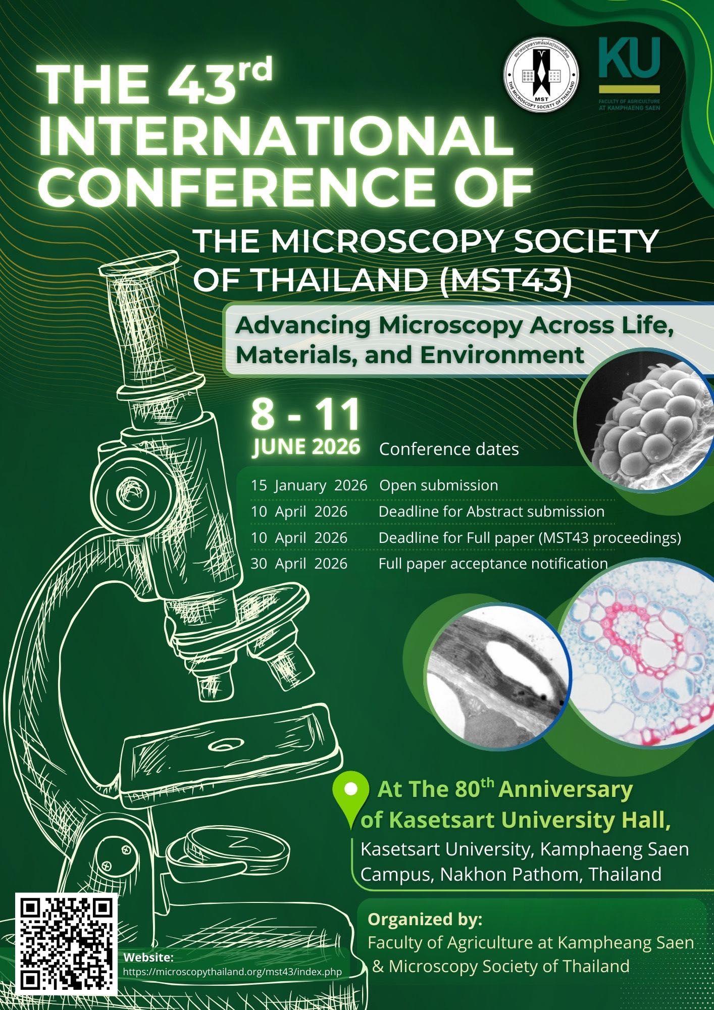 มหาวิทยาลัยเกษตรศาสตร์ โดยคณะเกษตร กำแพงแสน ร่วมกับสมาคมจุลทรรศน์แห่งประเทศไทย เป็นเจ้าภาพจัดงานประชุมวิชาการนานาชาติ “The 43″ International Conference of the Microscopy Society of Thailand” โดยกำหนดจัดขึ้นระหว่าง วันที่ 8 – 11 มิถุนายน 2569 ณ อาคาร 80 ปี มหาวิทยาลัยเกษตรศาสตร์ วิทยาเขตกำแพงแสนอำเภอกำแพงแสน จังหวัดนครปฐม