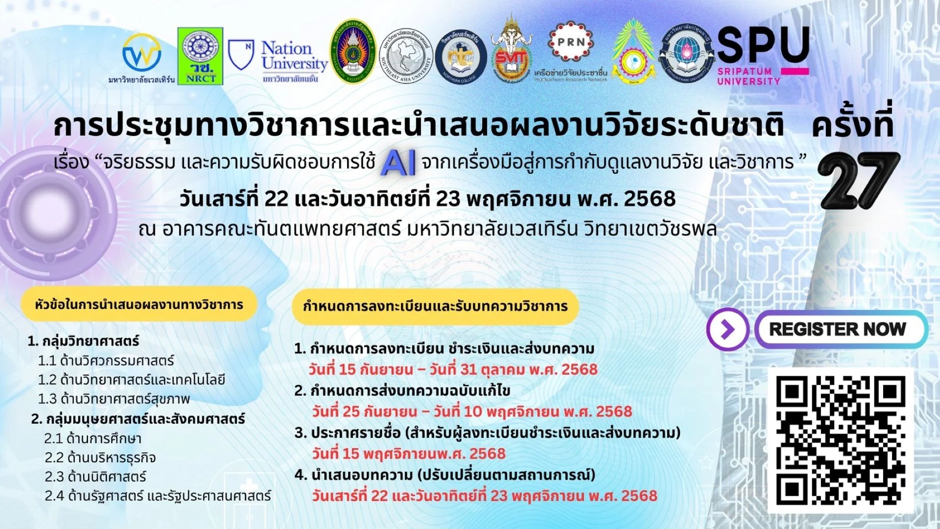 ด้วยมหาวิทยาลัยเวสเทิร์น ร่วมกับ สำนักงานการวิจัยแห่งชาติ (วช.) และสถาบันเครือข่ายประกอบด้วยมหาวิทยาลัยเนชั่น มหาวิทยาลัยราชภัฏพระนคร มหาวิทยาลัยเอเชียอาคเนย์ สถาบันเทคโนโลยีแห่งสุวรรณภูมิวิทยาลัยนอร์ทเทิร์น เครือข่ายวิจัยประชาชื่น มหาวิทยาลัยภาคตะวันออกเฉียงเหนือ มหาวิทยาลัยปทุมธานี และ วิทยาลัยบัณฑิตศึกษาด้านการจัดการ มหาวิทยาลัยศรีปทุม กำหนดจัดการประชุมวิชาการและนำเสนอผลงานวิจัยระดับชาติ ครั้งที่ 27 เรื่อง “จริยธรรมและความรับผิดชอบในการใช้ Al : จากเครื่องมือสู่การกำกับดูแลงานวิจัยและ วิชาการ” วันเสาร์ที่ 22 และวันอาทิตย์ที่ 23 พฤศจิกายน พ.ศ. 2568