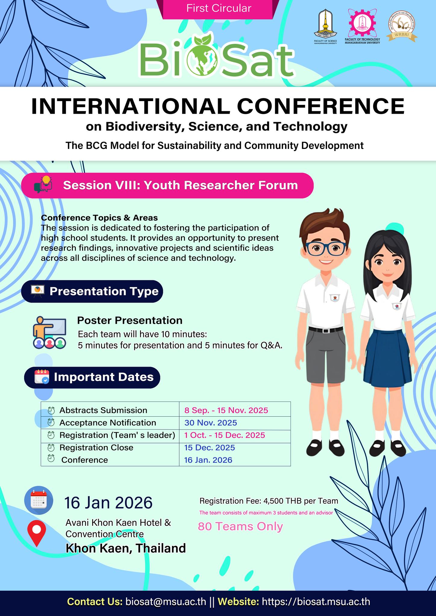 ด้วย คณะวิทยาศาสตร์ ร่วมกับ คณะเทคโนโลยี และสถาบันวิจัยวลัยรุกขเวช มหาวิทยาลัย มหาสารคาม ได้กำหนดจัดงานประชุมวิชาการนานาชาติ ครั้งที่ 3 International Conference on Biodiversity, Science and Technology (BioSat2026) ในหัวข้อ “The BCG Model for Sustainability and Community Development”
