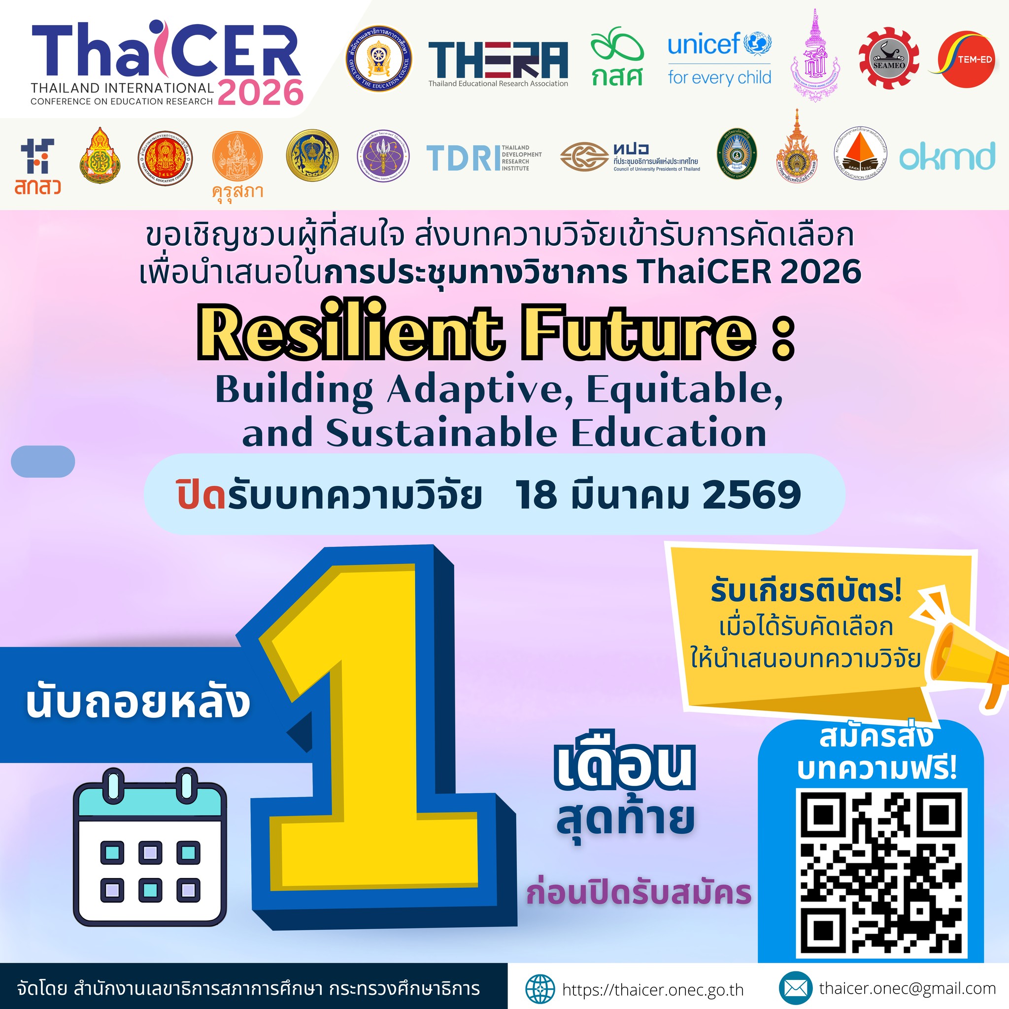 ผู้ที่สนใจส่งผลงานวิจัย สามารถส่งผลงานวิจัยได้ที่ https://thaicer.onec.go.th ภายในวันที่ 18 มีนาคม 2569