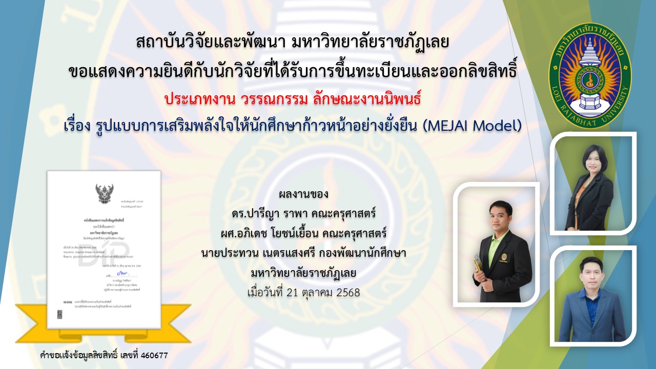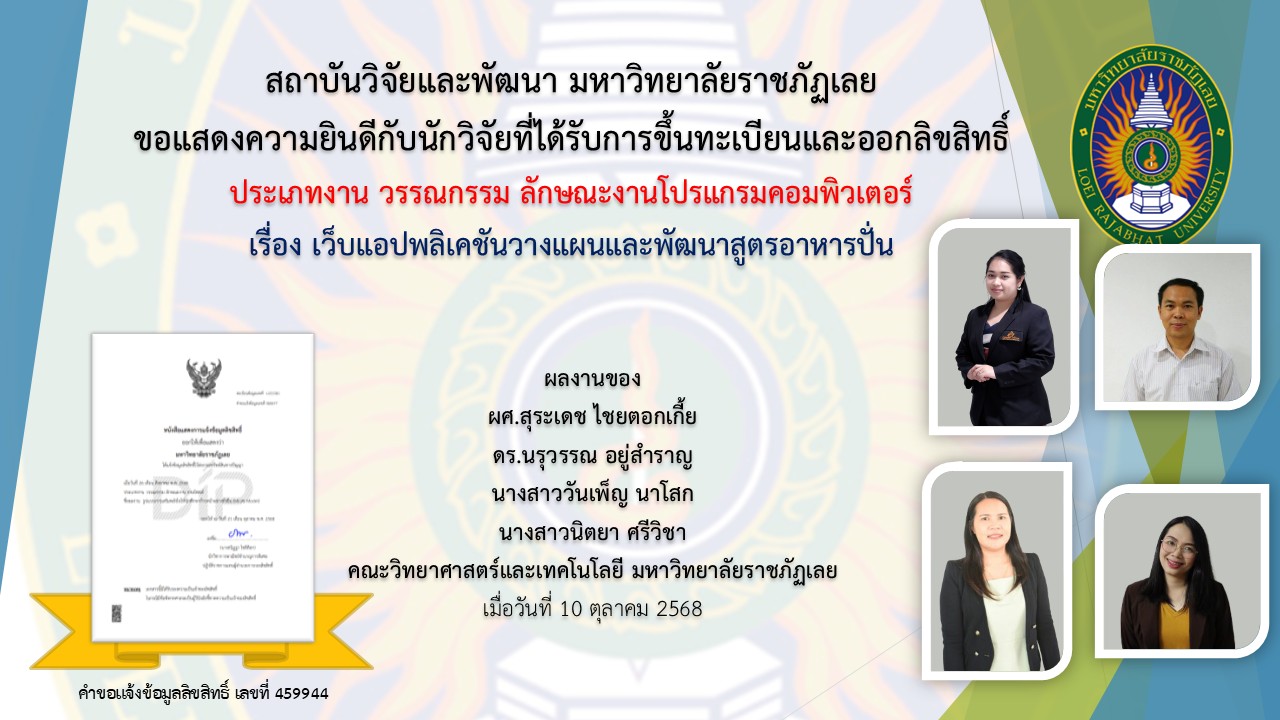 สถาบันวิจัยและพัฒนา ขอแสดงความยินดีกับนักวิจัยที่ได้รับการขึ้นทะเบียนและออกลิขสิทธิ์ มหาวิทยาลัยราชภัฏเลย