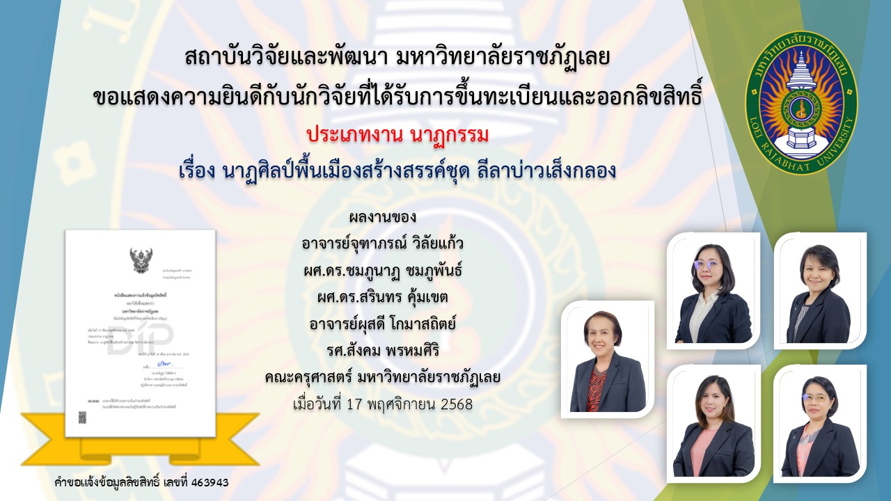 สถาบันวิจัยและพัฒนา สถาบันวิจัยและพัฒนา ขอแสดงความยินดีกับนักวิจัยที่ได้รับการขึ้นทะเบียนและออกลิขสิทธิ์ มหาวิทยาลัยราชภัฏเลย 15 มกราคม 2026 admin Spread the love สถาบันวิจัยและพัฒนา มหาวิทยาลัยราชภัฏเลย ขอแสดงความยินดีกับนักวิจัยที่ได้รับการขึ้นทะเบียนและออกลิขสิทธิ์ ประเภทงาน นาฏกรรมเรื่องนาฏศิลป์พื้นเมืองสร้างสรรค์ชุด ลีลาบ่าวเส็งกลองแจ้งข้อมูลลิขสิทธิ์ต่อกรมทรัพย์สินทางปัญญา เมื่อวันที่ 17 พฤศจิกายน 2568 ตามคำขอแจ้งข้อมูลลิขสิทธิ์ เลขที่ 463943 ทะเบียนข้อมูล น.000001โดยอาจารย์จุฑาภรณ์ วิลัยแก้วผู้ช่วยศาสตราจารย์ ดร.ชมภูนาฏ ชมพูพันธ์ผู้ช่วยศาสตราจารย์ ดร.สรินทร คุ้มเขตอาจารย์ผุสดี โกมาสถิตย์รองศาสตราจารย์สังคม พรหมศิริ Post Views: 32