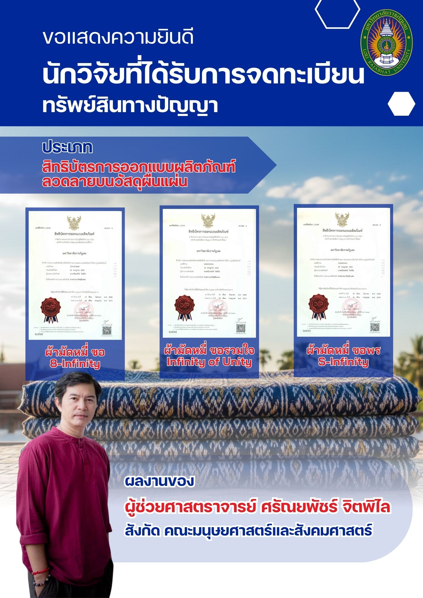 สถาบันวิจัยและพัฒนา สถาบันวิจัยและพัฒนา ขอแสดงความยินดีกับนักวิจัยที่ได้รับการขึ้นทะเบียนทรัพย์สินทางปัญญา 2 กุมภาพันธ์ 2026 admin Spread the love สถาบันวิจัยและพัฒนา มหาวิทยาลัยราชภัฏเลย ขอแสดงความยินดีกับนักวิจัยที่ได้รับการจดทะเบียนทรัพย์สินทางปัญญา ประเภท สิทธิบัตรการออกแบบผลิตภัณฑ์ ลวดลายบนวัสดุผืนแผ่น1. ผ้ามัดหมี่ ขอ 8-Infinity เลขที่สิทธิบัตร 113189 เลขที่คำขอ 22020030612. ผ้ามัดหมี่ ขอรวมใจ Infinity of Unity เลขที่สิทธิบัตร 113190 เลขที่คำขอ 22020030633. ผ้ามัดหมี่ ขอพร S-Infinity เลขที่สิทธิบัตร 113191 เลขที่คำขอ 2202003066โดยผศ.ศรัณยพัชร์ จิตพิไล สังกัดคณะ มนุษยศาสตร์และสังคมศาสตร์ Post Views: 13
