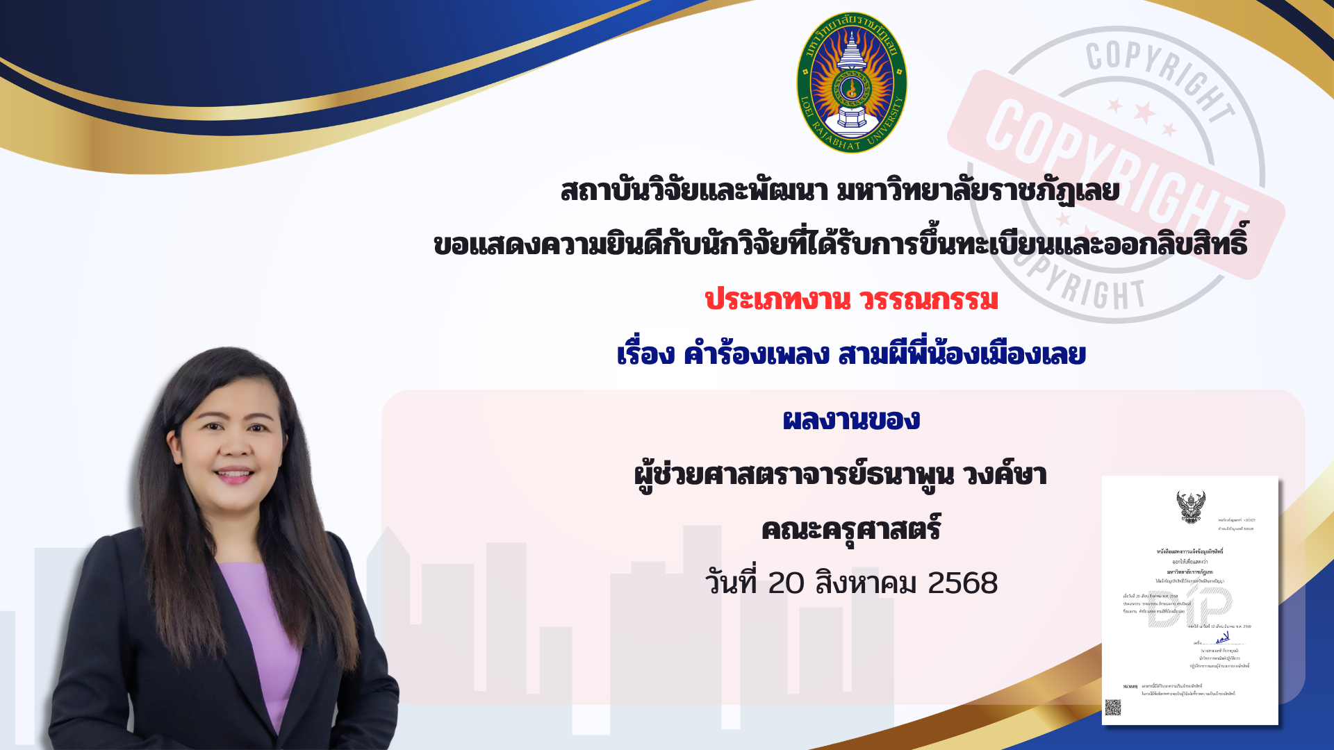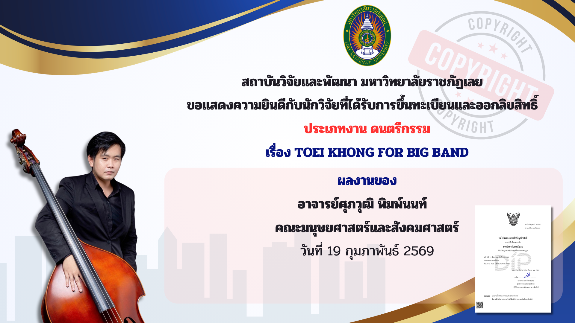 สถาบันวิจัยและพัฒนา สถาบันวิจัยและพัฒนา ขอแสดงความยินดีกับนักวิจัยที่ได้รับการขึ้นทะเบียนและออกลิขสิทธิ์ มหาวิทยาลัยราชภัฏเลย 20 มีนาคม 2026 admin Spread the love สถาบันวิจัยและพัฒนา มหาวิทยาลัยราชภัฏเลย ขอแสดงความยินดีกับนักวิจัยที่ได้รับการขึ้นทะเบียนและออกลิขสิทธิ์ ประเภทงาน ดนตรีกรรมเรื่องTOEI KHONG FOR BIG BANDแจ้งข้อมูลลิขสิทธิ์ต่อกรมทรัพย์สินทางปัญญา เมื่อวันที่ 19 กุมภาพันธ์ 2569 ตามคำขอแจ้งข้อมูลลิขสิทธิ์ เลขที่ 468143 ทะเบียนข้อมูล ด.000521โดยอาจารย์ศุภวุฒิ พิมพ์นนท์ สถาบันวิจัยและพัฒนา มหาวิทยาลัยราชภัฏเลย ขอแสดงความยินดีกับนักวิจัยที่ได้รับการขึ้นทะเบียนและออกลิขสิทธิ์ ประเภทงาน วรรณกรรมเรื่องคำร้องเพลง สามผีพี่น้องเมืองเลยแจ้งข้อมูลลิขสิทธิ์ต่อกรมทรัพย์สินทางปัญญา เมื่อวันที่ 20 สิงหาคม 2568 ตามคำขอแจ้งข้อมูลลิขสิทธิ์ เลขที่ 460520 ทะเบียนข้อมูล ว.000629โดยผู้ช่วยศาสตราจารย์ธนาพูน วงค์ษา Post Views: 22