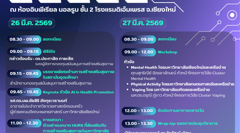 conference 26 กุมภาพันธ์ 2026 admin ขอเชิญชวนเข้าร่วมการประชุมวิชาการมหาวิทยาลัยสร้างเสริมสุขภาพระดับชาติ ครั้งที่ 3 ขอเชิญชวนเข้าร่วมการ Read More